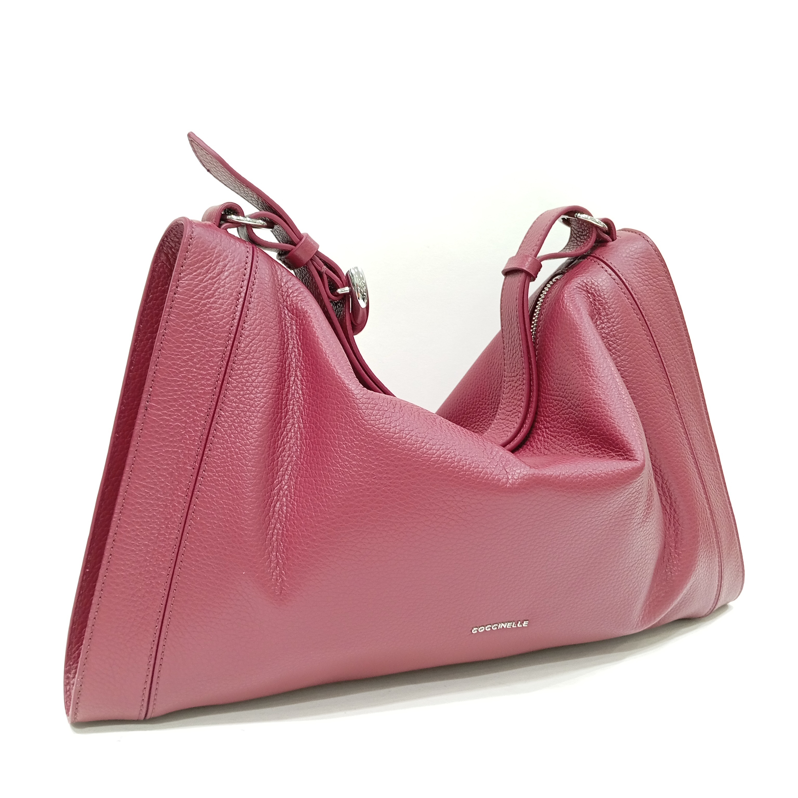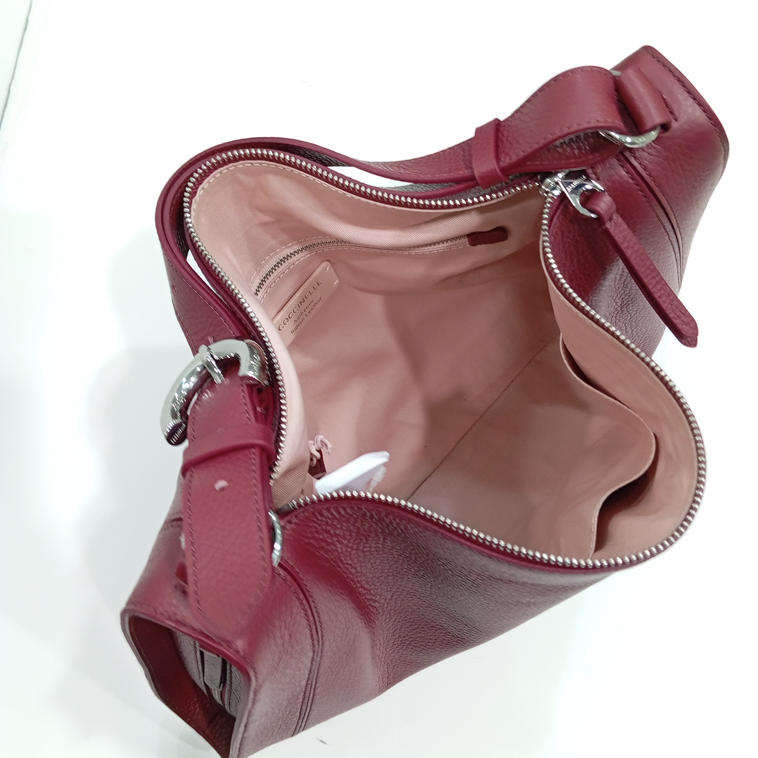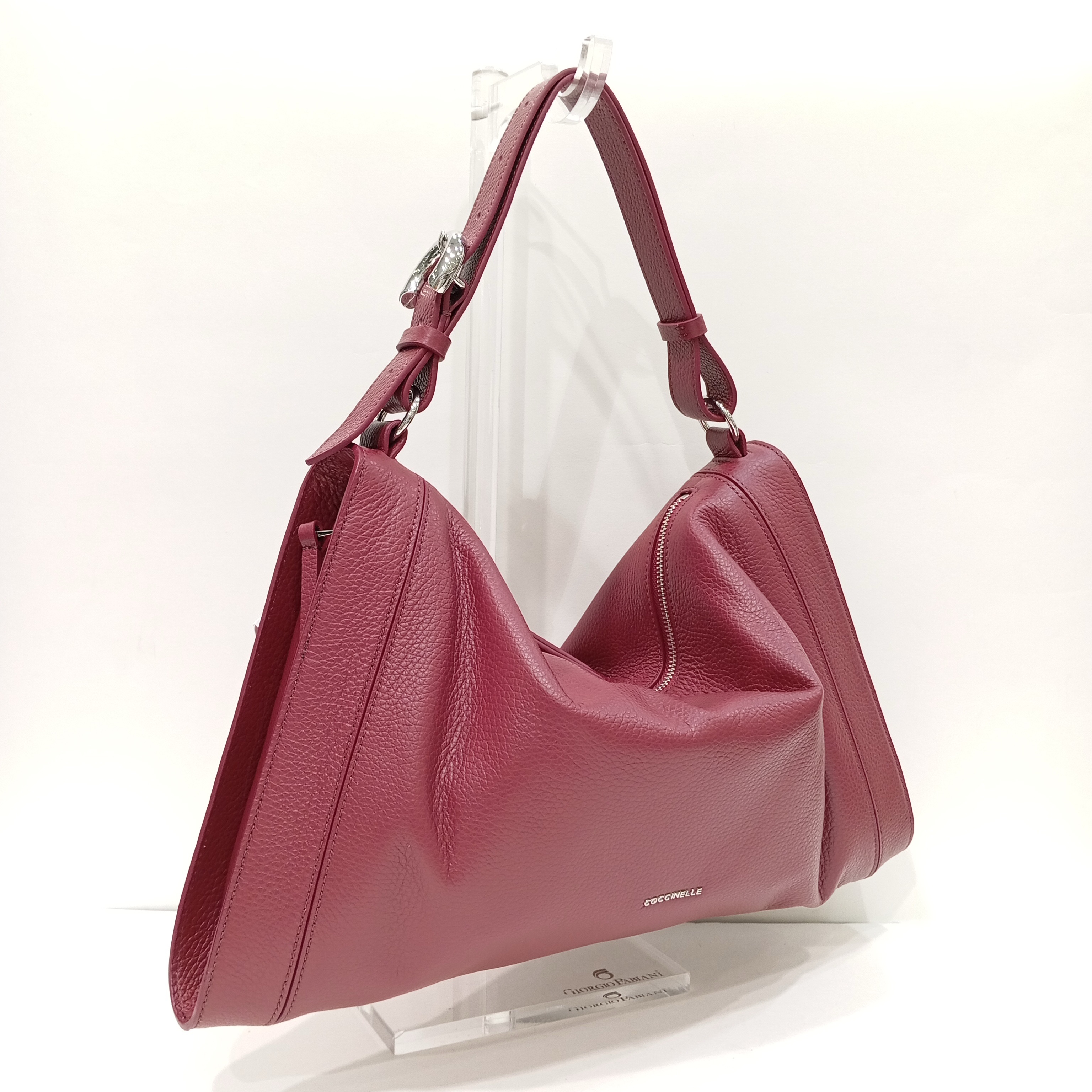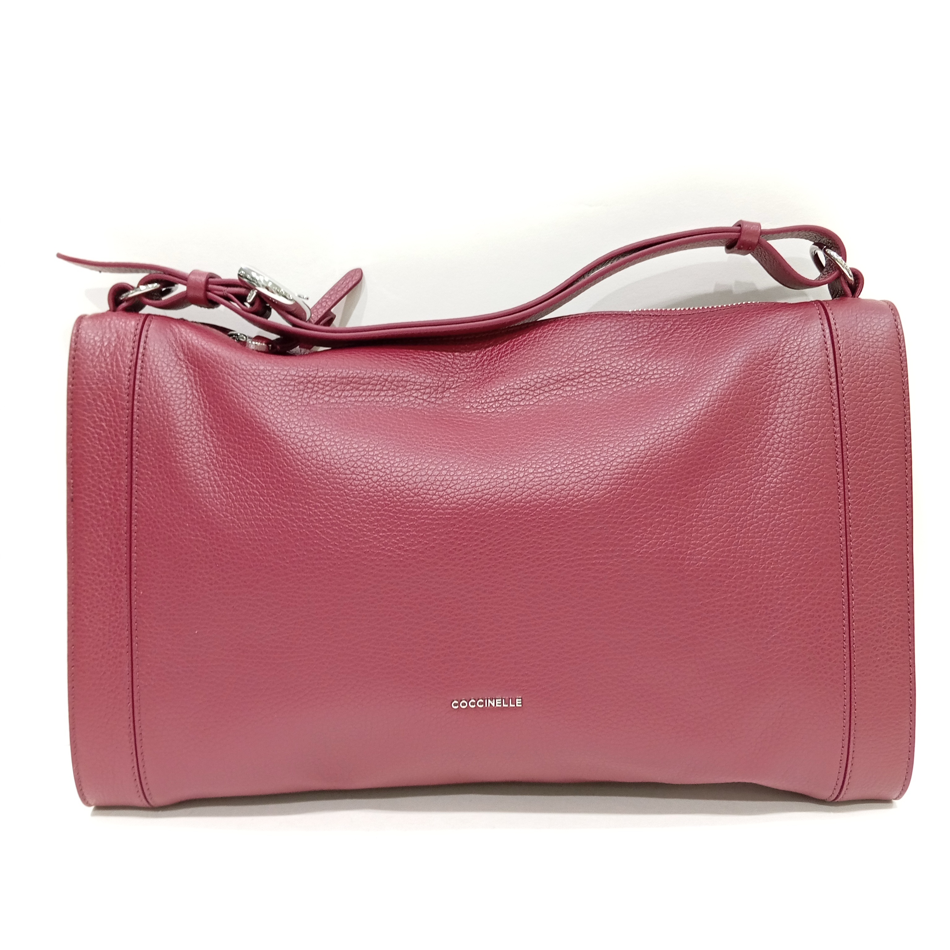 Стильная сумка из натуральной кожи брусничного цвета от знаменитого итальянского бренда Coccinelle.